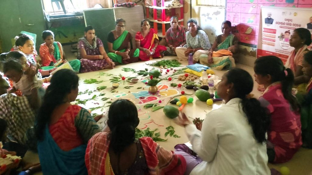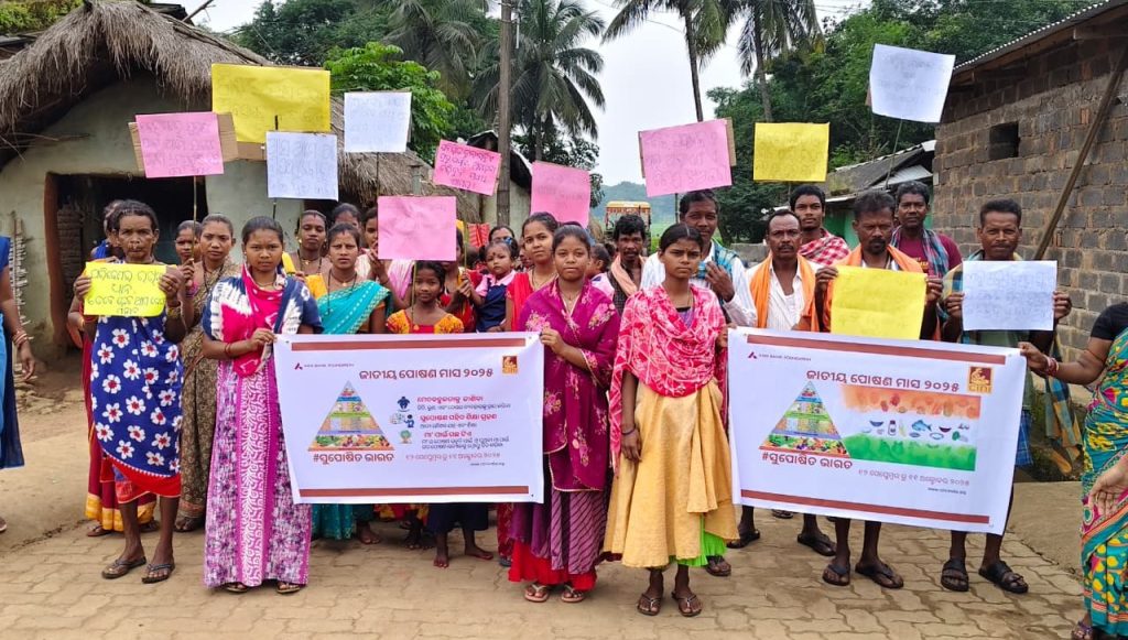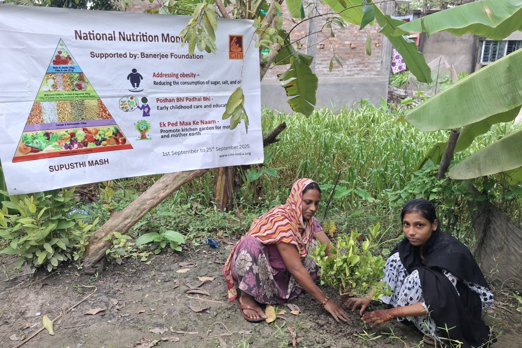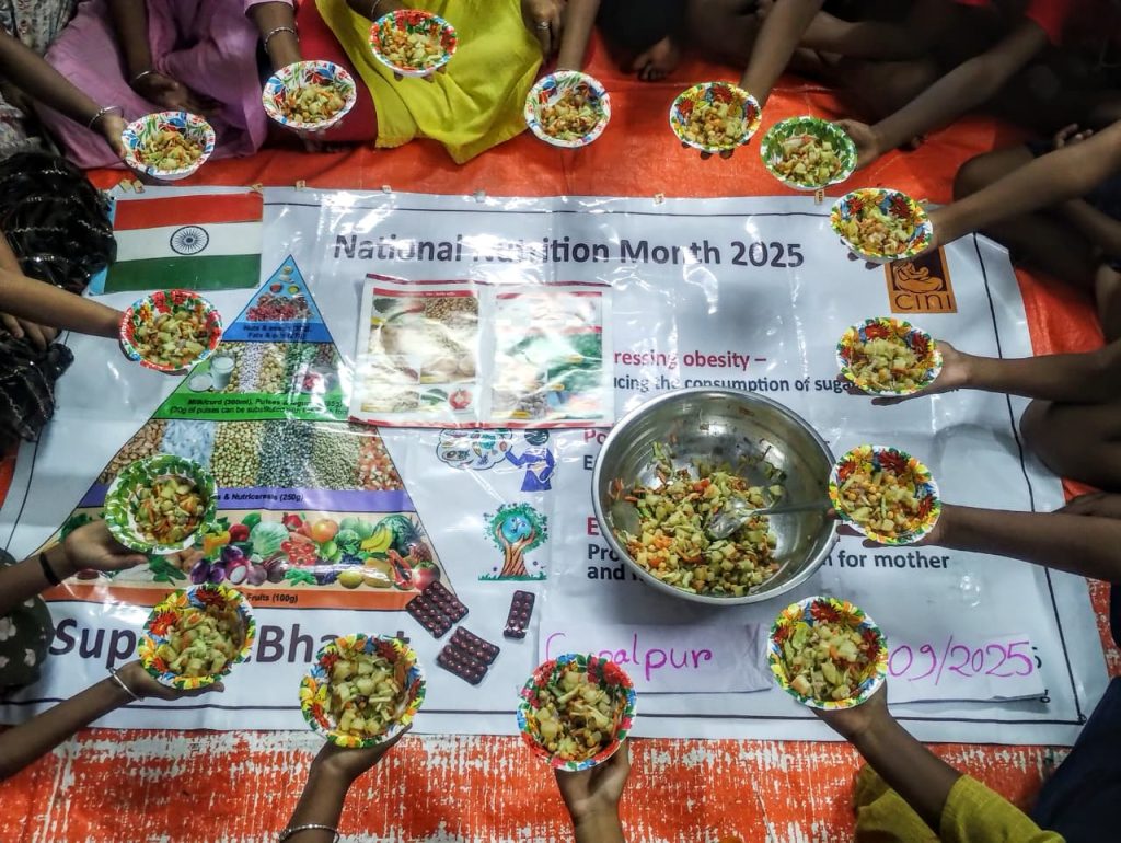 CINI organised various programmes throughout the month at Odisha under different projects. A ‘Nutrition Walkathon’ was organised with community people and Service providers at Bhubaneswar. CINI conducted a special ‘Ek Ped Maa Ke Naam Plantation Drive’. In partnership with the Harsha Trust, we distributed 100 saplings of nutritious plants like papaya, lemon, guava, and drumstick to families. In collaboration with the H&FW department of Boipariguda, CINI set up a special Nutrition Kiosk at the CHC, where free BMI screenings and personalized diet counselling are available for all. Poshan Maah was observed in all the 30 AWCs under Khambesi PHC areas with 404 participants along with AWW, ASHA workers. Timely initiation of complementary feeding for the child after completion of 6 months and nutrition care of the mother during pregnancy and after delivery was the focus of the discussion during the observation.