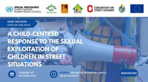 The event — co-hosted by the Consortium for Street Children, the Office of the UN Special Rapporteur, CINI (India), Grambangla Unnayan Committee (Bangladesh), and Bahay Tuluyan (Philippines) — featured the UN Special Rapporteur presenting her report on “A Child-Centred Response to the Sexual Exploitation of Children in Street Situations”, where Street Champions were recognized as a model of resilience. A high-level panel of government leaders, researchers, and policy influencers discussed child-rights-centred, innovative, grassroots solutions to protect and empower children. Inclusion, hope, and action begin with listening to children.